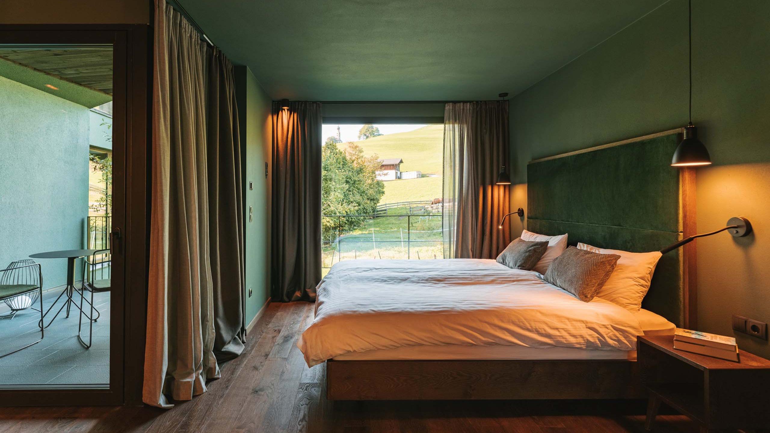 ca. 35qm - Ebenso geräumig und luxuriös wie die Secret Garden Suite ist dieses Chalet ausgestattet mit eigener Sauna, einem Balkon mit Badewanne und hochwertigem Interieur. Das Chalet hat den Blick auf die Kapelle St. Valentin, es verfügt über eine edle Holzverkleidung, großflächige Fenster und stimmungsvolle Details. Natürliche Materialien, stilvolle Grünpflanzen und eine offene, sonnendurchflutete Architektur geben Ihnen das Gefühl, direkt mit der Natur verbunden zu sein.