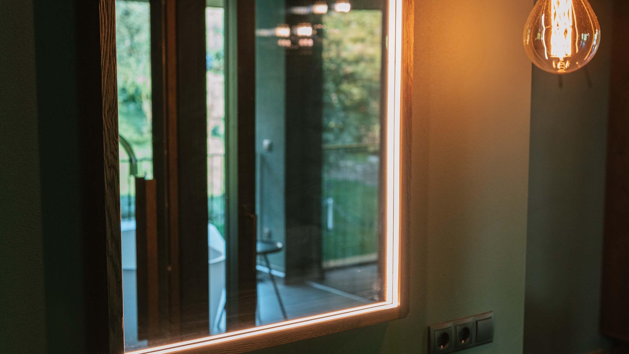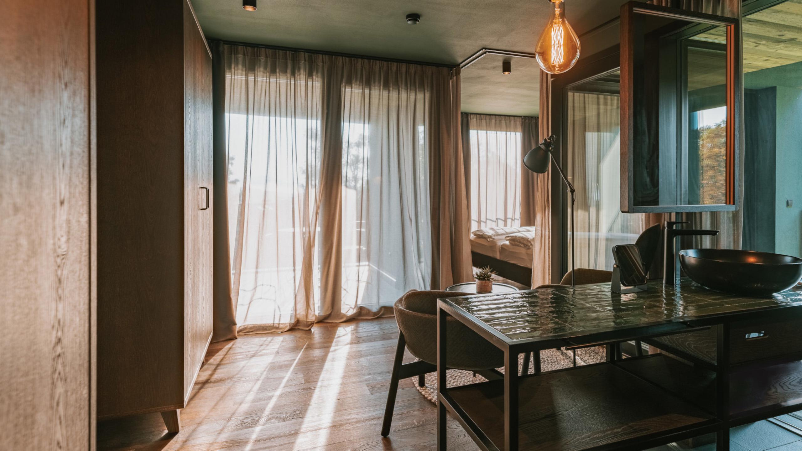 approx. 35 sqm Our luxury chalet is equipped with its own sauna, two balconies, one of which has a bathtub, a comfortable lounger net, and high-quality interiors. It has elegant wood paneling, large windows, and atmospheric details. Natural materials, green plants, and an open, light-flooded architecture make you feel at one with nature.