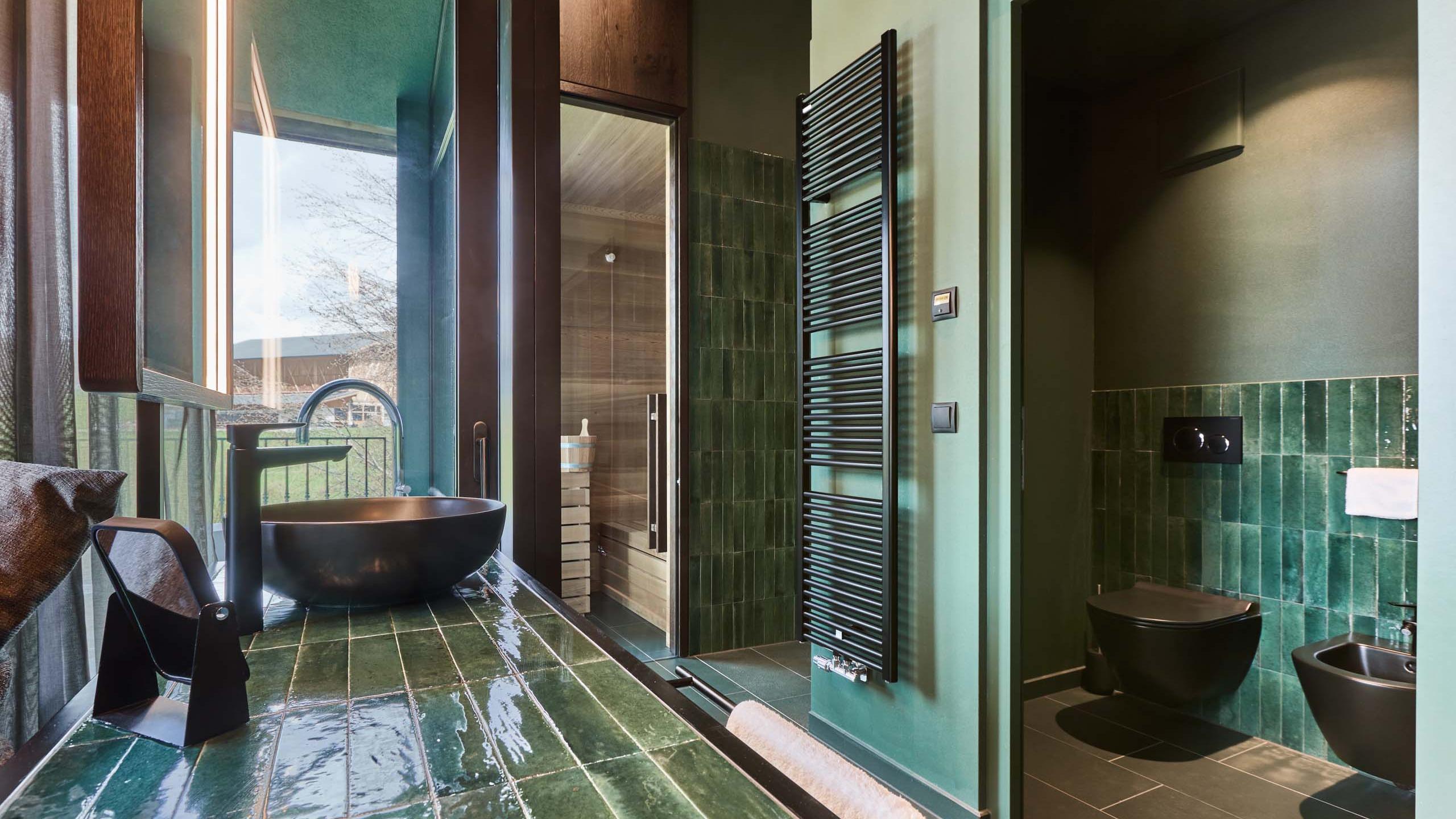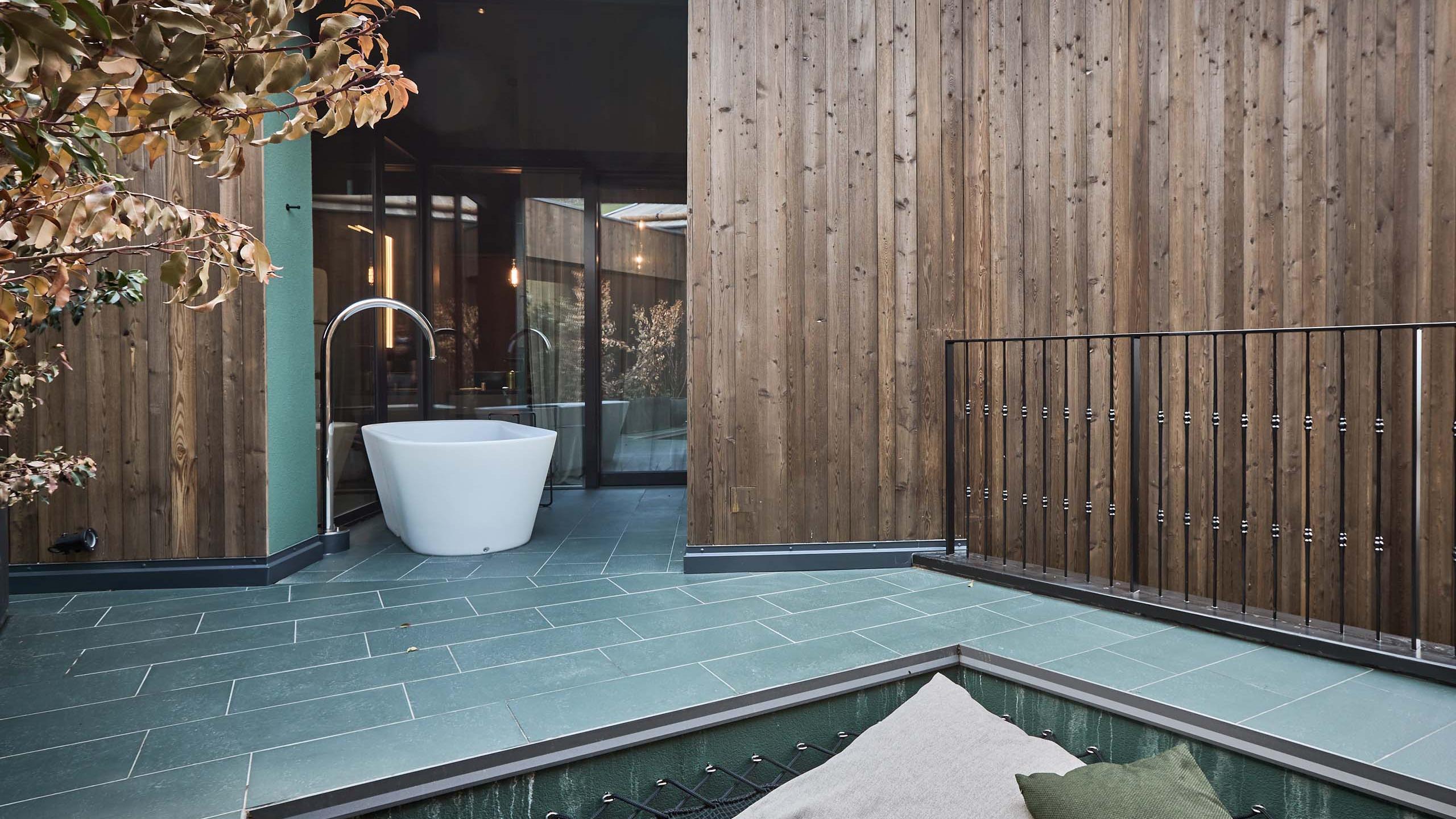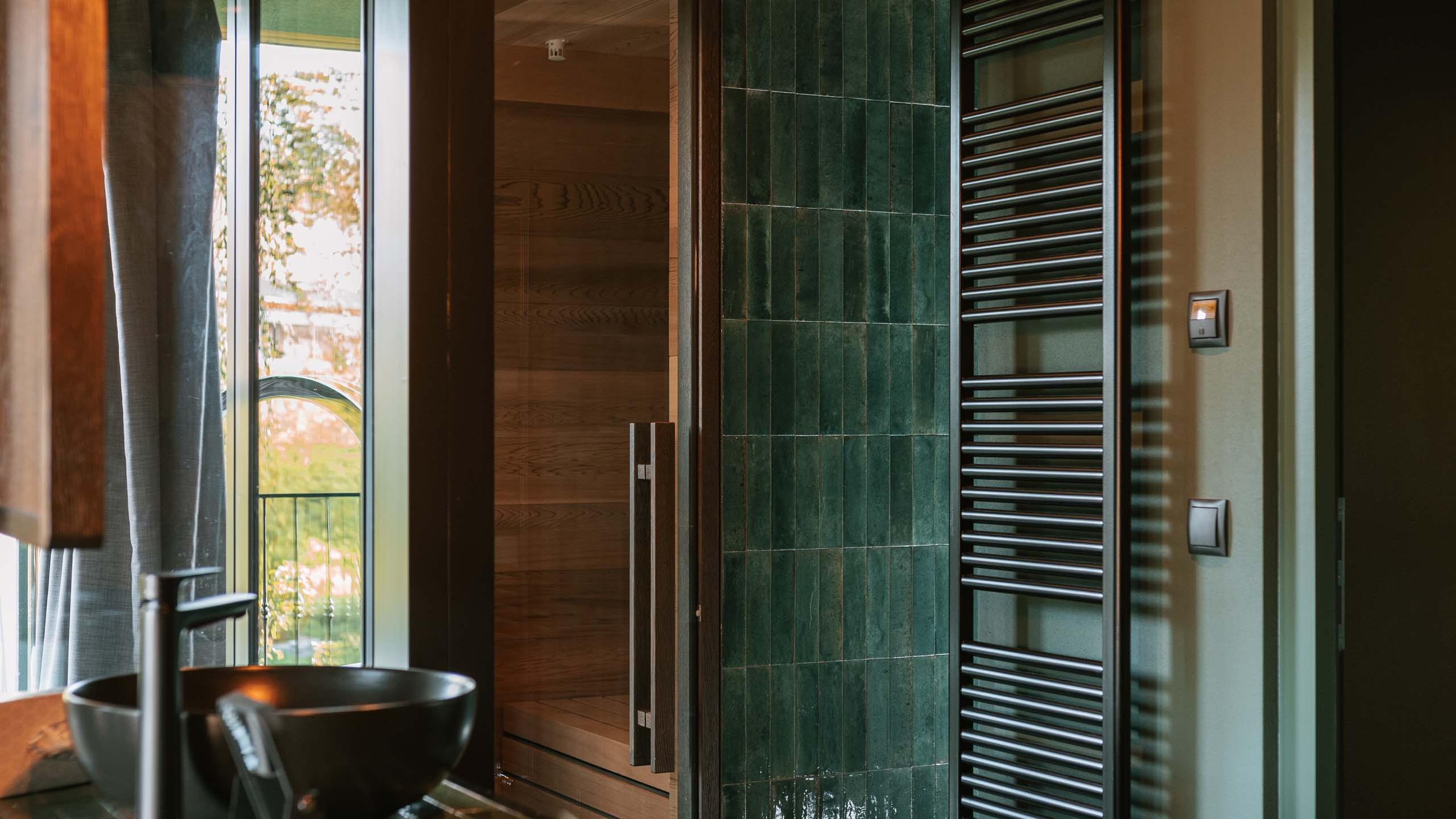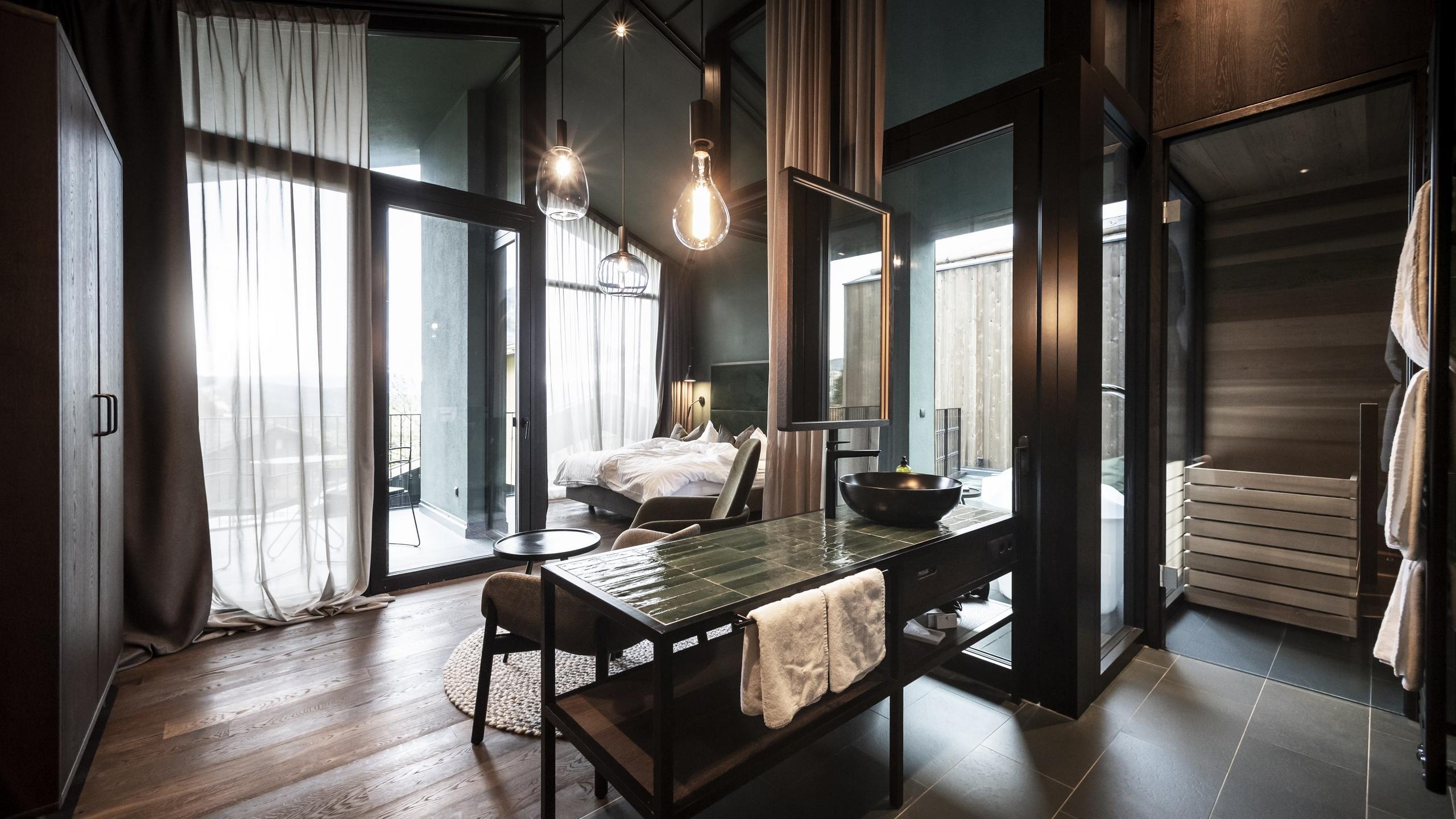 approx. 35 sqm - Our luxury chalet is located on the upper floor and equipped with its own sauna, two balconies, one of which has a bathtub, a comfortable lounger net, and high-quality interiors. It has elegant wood paneling, large windows, and atmospheric details. Natural materials, green plants, and an open, light-flooded architecture make you feel at one with nature.